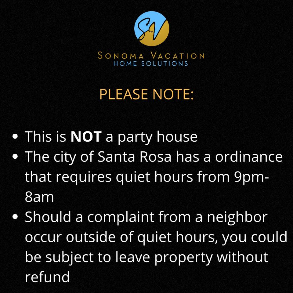 ✅ The city of Santa Rosa has mandatory quiet hours for vacation rentals daily from 9pm-8am. This is strictly enforced at this home. ✅ Property is in a neighborhood setting. Not a party house. ✅ Max of 6 short-term overnight guests allowed. ✅This home is in a peaceful residential neighborhood, and while it does offer a private pool and spa for guests to enjoy, it may not be the best fit for all groups, especially those hoping for a livelier or party-style atmosphere. Sound tends to carry more than expected, and even respectful gatherings can sometimes raise concerns with full-time neighbors. That said, if your group is looking for a relaxing, laid-back getaway and is comfortable being mindful of volume, this can be a wonderful home base. ✅ Please note that the pool is solar heated from late April - to early October *Temperature is dependent on weather conditions. ✅ Pets are not allowed in the pool. ✅ Spa is a commercial-style inground spa. It will take between 60 and 90 minutes to heat to full temp depending on the time of year. Your hostess can preheat the spa upon your request. Per the city of Santa Rosa required vacation quiet hours Spa will heat till 9 PM daily. ✅ There are 3 cars maximum allowed at this property. 2 on-site, 1 street. ✅ Up to two Dogs are accepted on a case-by-case basis for an additional fee. Please inquire directly. ✅ Classic arcade game. Includes many favorites like Pac-Man. ✅ Electric vehicle charging is prohibited at the property. ✅ Peacock subscription that includes live TV is available upon request. ✅ The game room includes an air hockey table, poker table, oversized TV, and a couch. ✅ Kindly note that we are unable to accommodate cats due to a severe allergy of immediate family members. 🛎️ Friendly Note from Your Host We do our very best to keep the home, amenities, and property in great shape so you can enjoy a smooth and relaxing stay. That said, please understand that: - Occasional issues can arise with things like Wi-Fi, spa, pool, appliances, or other amenities — especially due to weather, utility outages, or mechanical failure. - Acts of nature (like storms, power outages, or earthquakes) are outside of our control. While we strive to communicate and respond quickly, some interruptions can’t be predicted or immediately resolved. We strongly recommend purchasing travel insurance to cover any unexpected disruptions not directly caused by the host. ⚠️ Acknowledgement & Liability. By booking the use of the home and property guests use at their own risk and agree to comply with all posted rules and assume all risk of injury, illness, damage, lost items, or interruptions to amenities or services during their stay. Failure to follow the rules may result in immediate eviction without refund and/or additional cleaning or repair charges. ⚠️ IMPORTANT: If any damage occurs that requires us to temporarily take the home or its amenities off the market, guests may be responsible for the cost of repairs and any lost income during that time. Thanks so much for your understanding — and we look forward to hosting you! Santa Rosa Permit Number: SVR25-012